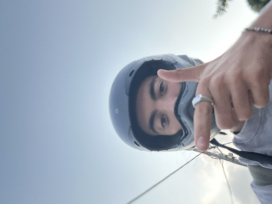 An individual is depicted in a close-up, slightly low-angle shot, facing the camera directly. The person, appearing to be a young male, wears a dark gray or black full-face helmet with a visible chin bar and ventilation details, obscuring the lower half of the face while the eyes and nose bridge are visible. The right hand is extended forward, with the index finger pointed directly towards the viewer. A silver-colored signet ring is present on the ring finger, and a beaded bracelet, possibly white, is on the wrist. The individual wears a light gray top and a black backpack strap is visible over the left shoulder. The background features a clear, light blue sky with minimal cloud cover. To the left, a utility pole with several wires is partially visible, while out-of-focus green foliage, likely from a tree, is present on the far right. The scene is located outdoors in Tel Aviv, Israel.