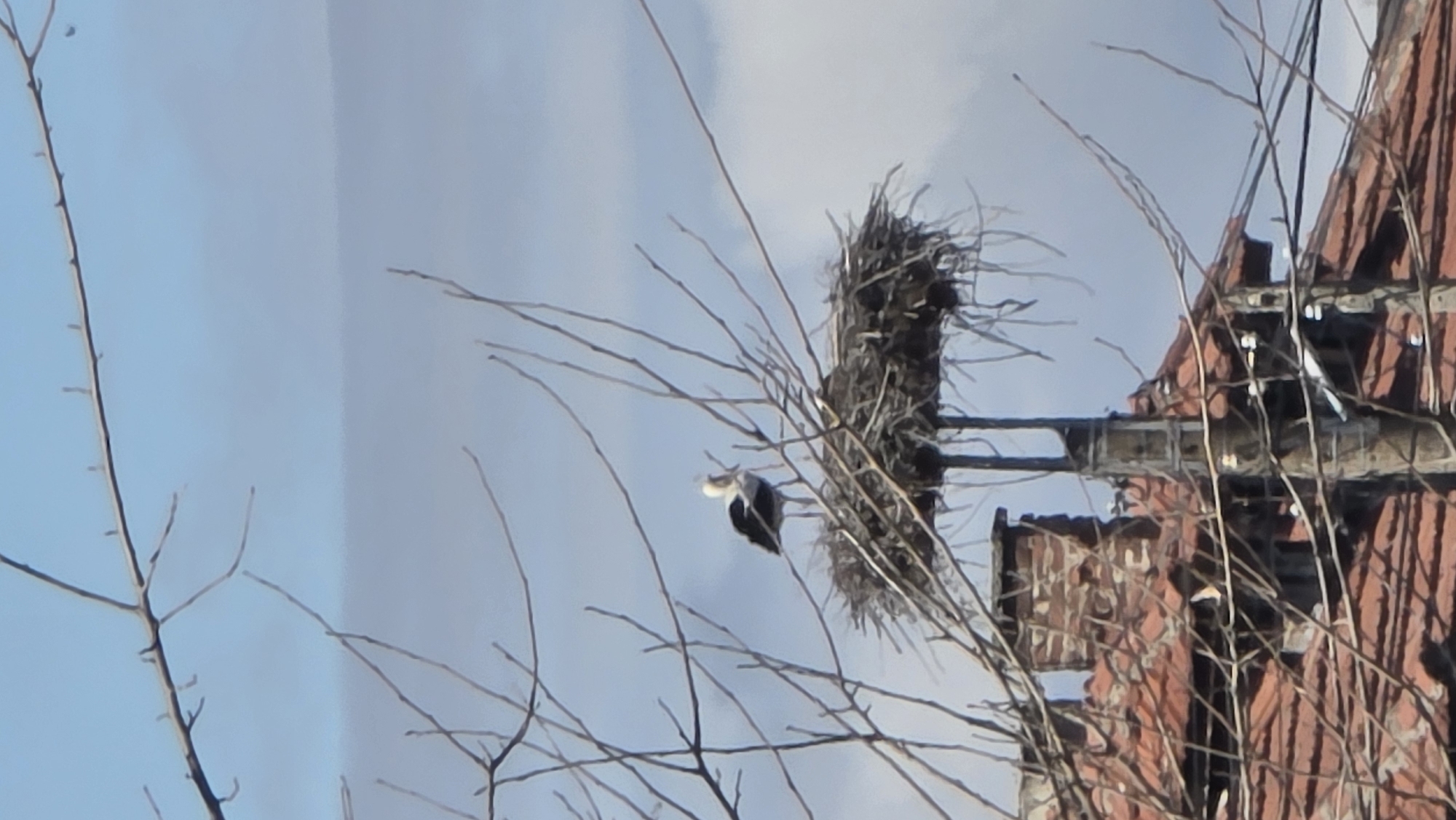 - "A bird is perched near a large bird nest atop a deteriorating brick building structure" by FM-etvNA2, licensed under CC BY 4.0