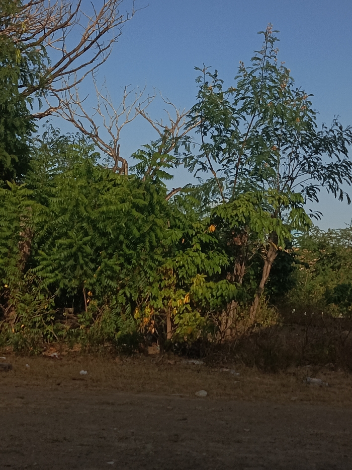 The image displays an outdoor environment in La Tagua, Venezuela, dominated by natural vegetation under a clear blue sky. The upper portion of the frame features an expanse of bright, cloudless blue sky. Below the skyline, a dense arrangement of trees and shrubs occupies the mid-ground and background. This vegetation consists primarily of various green leafy species, with some leaves exhibiting lighter green and yellow-green hues. Several leafless, light brown or greyish tree branches are visible, particularly in the upper-left and central areas, extending against the sky. The lower foreground presents a flat, dry, reddish-brown earth surface, consistent with a dirt path or undeveloped ground. Sparse, small, light-colored debris, possibly stones or discarded items, are scattered across this ground. The scene is illuminated by natural daylight, indicating daytime conditions. No human or animal subjects, man-made structures, or vehicles are present within the frame.
