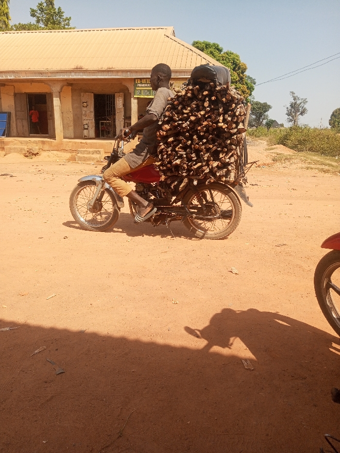 - "An outdoor scene in Kakau, Nigeria, depicts a male individual riding a red motorcycle heavily laden with firewood" by FM-Bivw32, licensed under CC BY 4.0