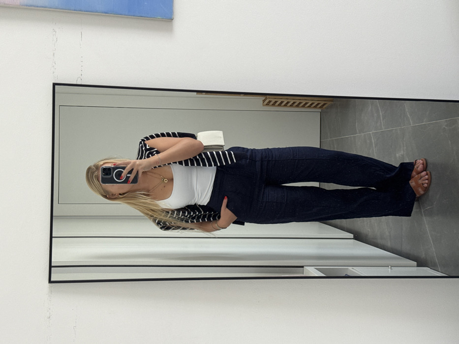 A woman is reflected in a mirror, taking a selfie. She has long blonde hair and wears a white tank top, a black and white striped cardigan, and dark-colored pants. Her phone is visible in her hand. She is wearing sandals and a necklace. The background includes a white wall, light grey tile floor, and a toilet paper dispenser. Above the mirror hangs a blue and white painting. The mirror has a black frame.