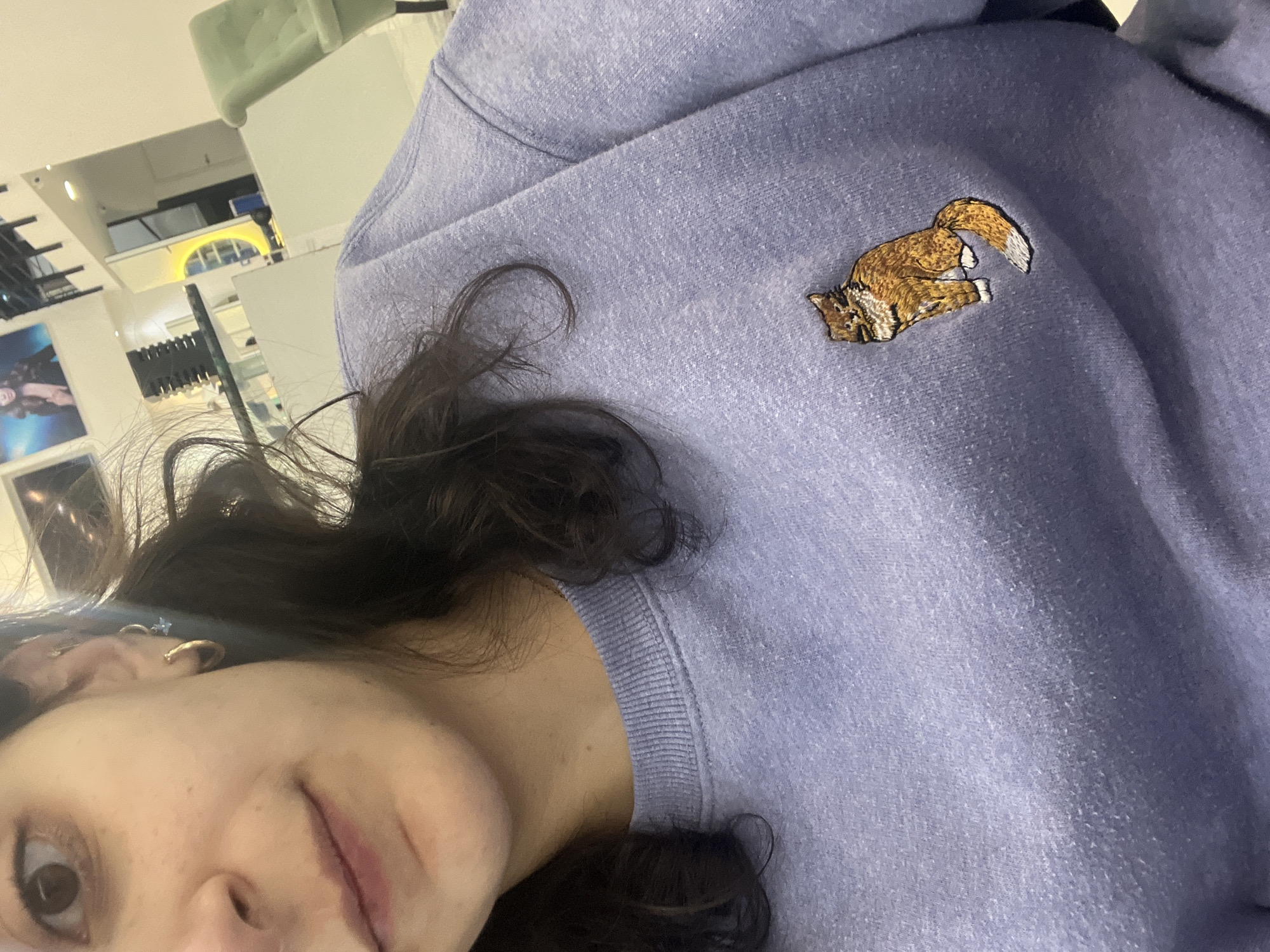 A close-up, slightly angled, indoor shot features a woman wearing a lavender-colored sweater. The sweater is adorned with a small, embroidered image of a reclining fox. Part of the woman's face, including her eye, nose, and cheek, is visible in the bottom left corner of the frame. Her dark hair falls across the sweater and neck area. In the blurred background, there's a partial view of what appears to be a commercial establishment with shelving units and displays, indicative of a retail setting. The image does not provide sufficient information to specifically locate it within Jesús del Monte, Mexico.