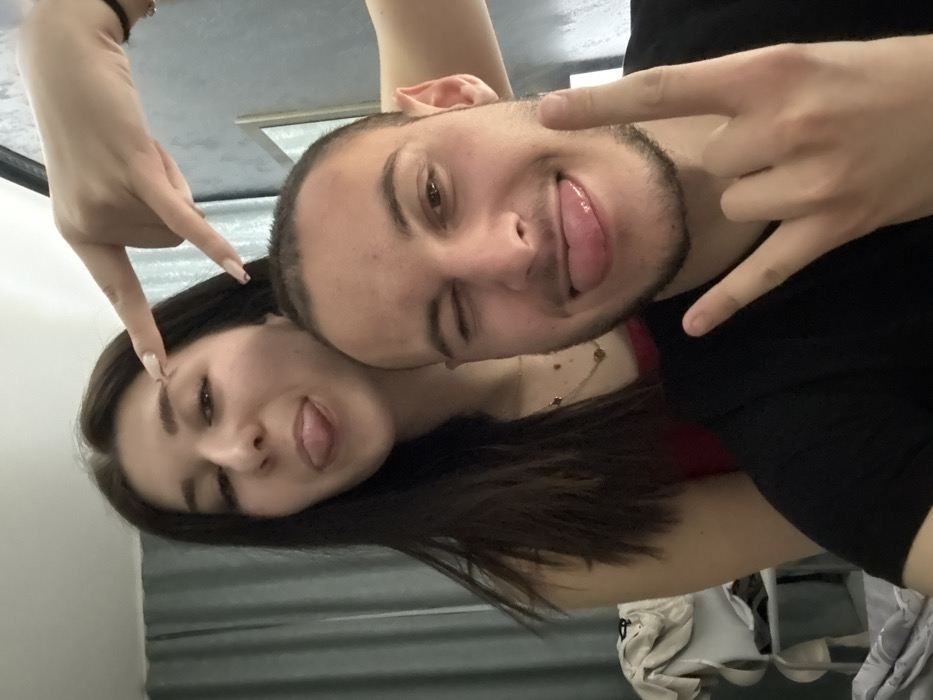 An indoor photograph depicts two young adults, a female and a male, posed for a close-up