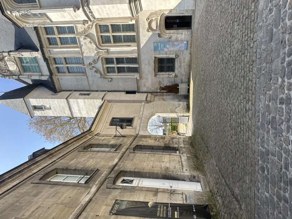The image depicts an outdoor cobblestone courtyard within the city of Beauvais, France, illuminated by natural light under a clear blue sky. To the left, a three-story stone building with rectangular windows and a white ground-level door features a vertical black banner advertising "OISE" and "TRÉSORS DE LA RENAISSANCE DANS L'OISE," noting an exhibition from "04/05/2024 - 01/09/2024." An arched stone passageway, topped by a small structure, connects this building to a larger, more ornate multi-story building on the right. This right-hand structure is constructed from lighter stone, exhibiting Gothic or Renaissance architectural details including decorative window frames, leaded glass, and a prominent turret with a dark conical roof. A black, wrought-iron lantern hangs from the archway. A blue banner marked "YK" and "Accueil" with a floral design is affixed to the right building's facade, near an ornate doorway. Adjacent to this entrance, a rectangular planter contains a small, conical evergreen plant. Through the archway in the background, a single individual wearing a light-colored jacket is partially visible, standing or walking, with bare tree branches and a brighter outdoor area beyond. The courtyard surface consists of irregularly shaped, dark grey cobblestones.