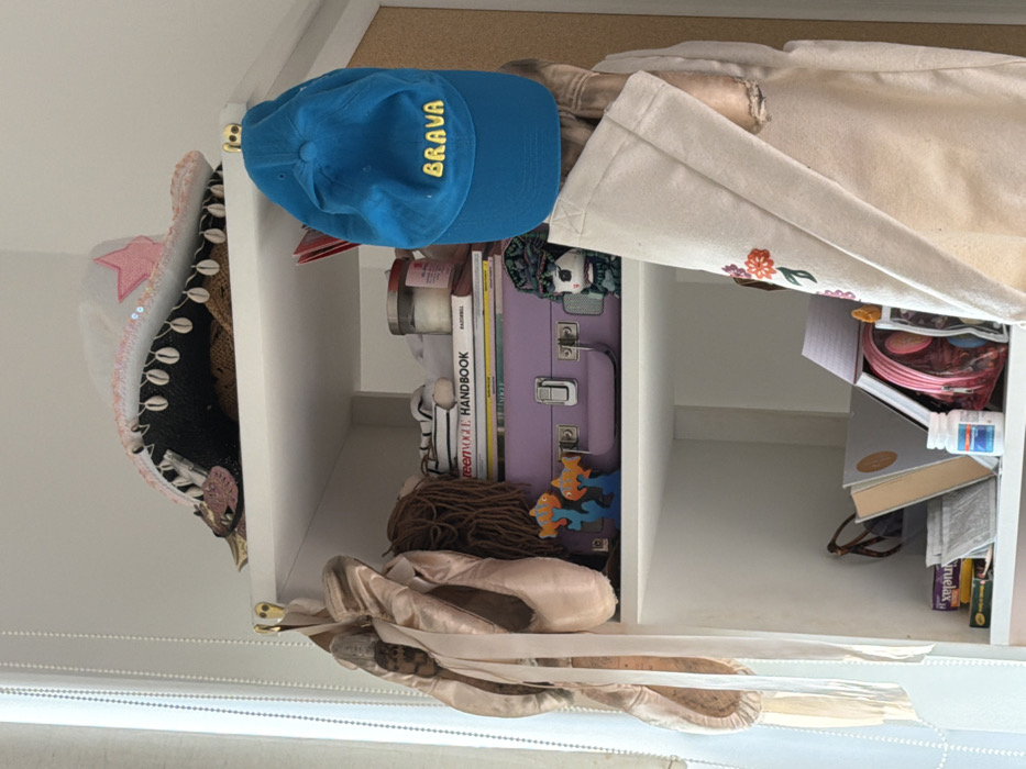 A white shelf contains assorted items. On the top shelf are a blue baseball cap embroidered with "BRAVA," a partially visible light-colored bag, a cowgirl hat, a jar, and several books. The lower shelf holds brown yarn, two pointe shoes, and a small purple suitcase with fish decorations. Other items like a book with glasses, a pencil, and a cosmetic bag are also visible. The shelf appears to be a storage space for various personal belongings.