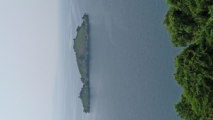 n aerial view of a body of water with a long, narrow island. The island is covered in green vegetation. The water is calm and reflects the sky. The right side of the image features a thick cluster of green trees. The scene is generally peaceful and serene.