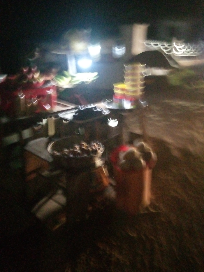 A blurry, dark image shows what appears to be a food stall at night. The stall has lights illuminating fruits or vegetables. A red crate sits on the left side. In the foreground, there's a metal bowl filled with dark objects, possibly food being cooked, and a red container with light-colored contents next to it. The ground is dark and indistinct. The image is out of focus, making it difficult to discern specific details.