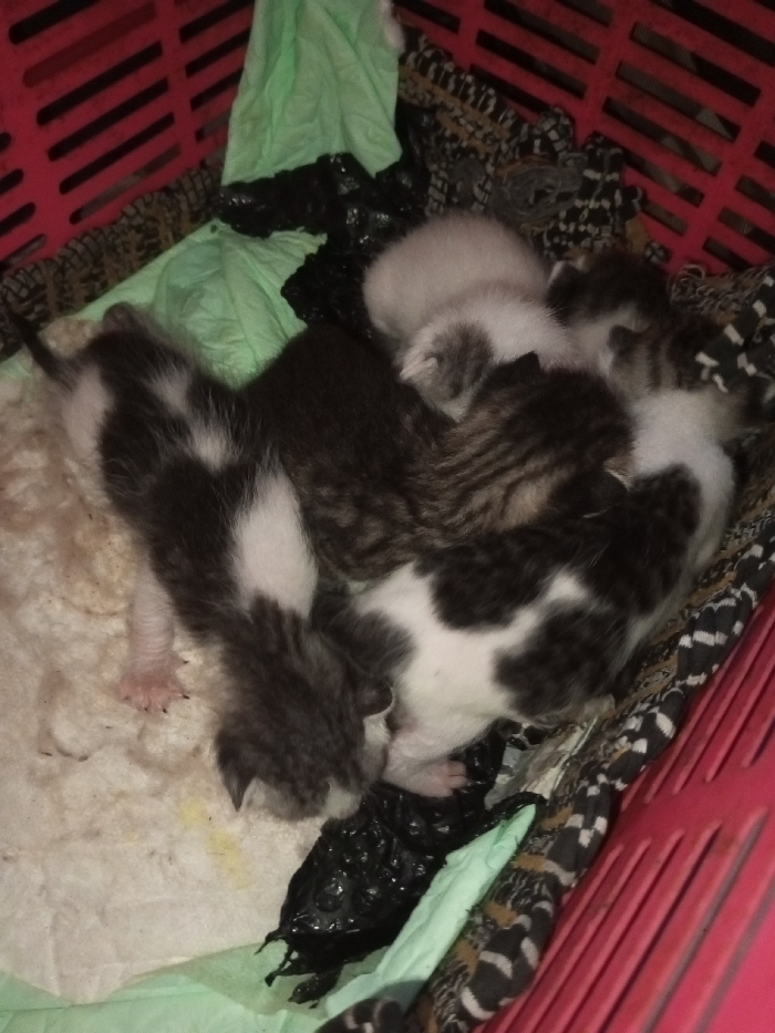 - "A group of newborn kittens huddle together in a red plastic basket" by FM-JzEnU2, licensed under CC BY 4.0