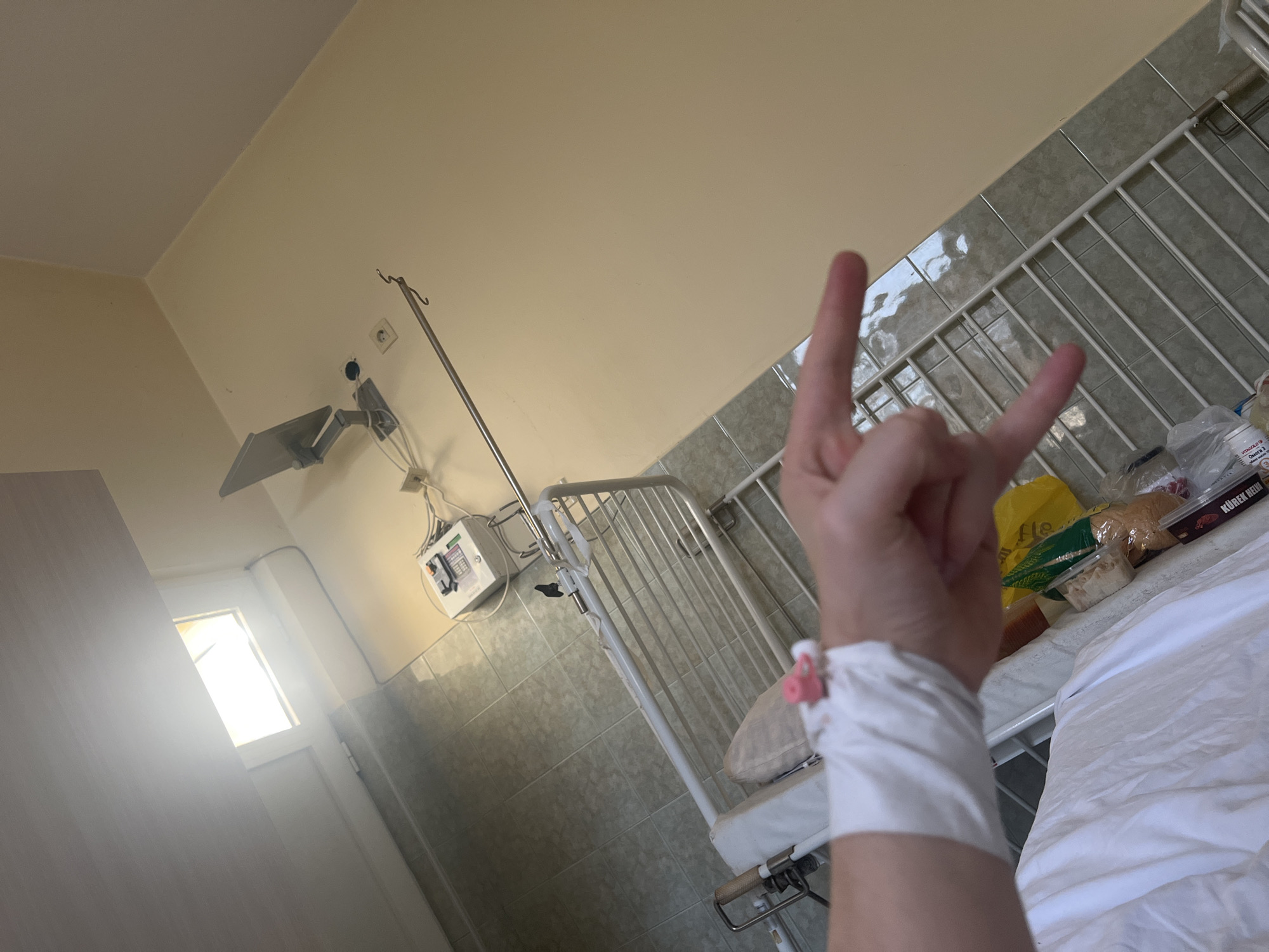 The photograph appears to have been taken in a hospital room. The walls are cream colored. A hospital bed with white linens is visible, as well as an IV stand and medical equipment. A hand with an IV line in place is raised in a "rock on" gesture. The location is possibly Stara Zagora, Bulgaria but this cannot be verified.