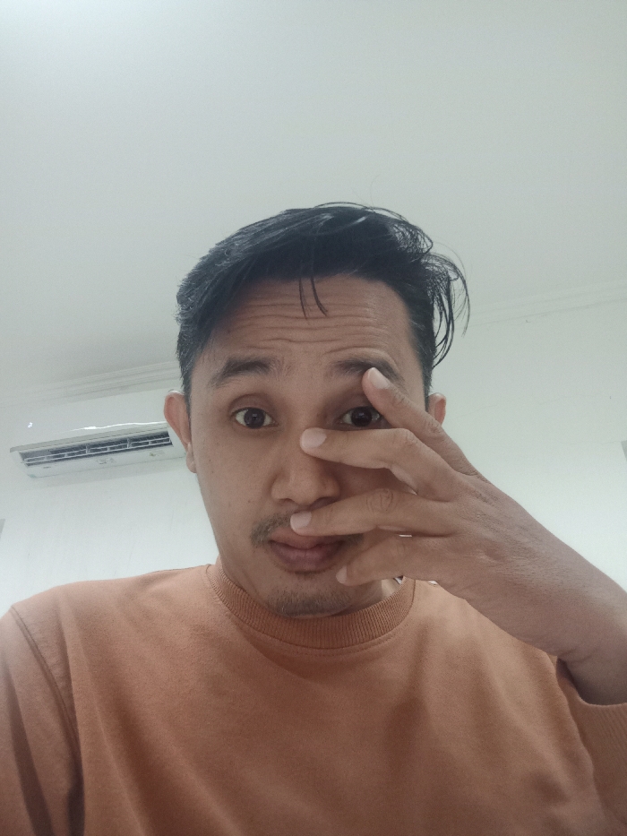 A man wearing an orange long-sleeved shirt poses close to the camera. His black hair is slightly disheveled. He has a mustache and light facial hair. His right hand is raised, obscuring part of his face. A white air conditioning unit is visible on the wall behind him. The background is a plain white wall and ceiling. He appears to be indoors.