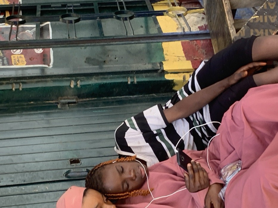 In the city of Gawuna, Nigeria, two individuals are seated against a closed, dark green corrugated metal roll-down shutter, which is marked with a faded poster exhibiting partial text "NOW" on the upper right. The person on the left wears a rose-colored head covering and matching loose garment, holding a black smartphone in their right hand. White wired earphones are plugged into the smartphone, with wires extending to both individuals. A silver foil packet rests on this person's lap. The second individual, positioned to the right, has reddish-brown braided hair and wears a white t-shirt with horizontal black and light green stripes, and black leggings. One earbud is inserted into their left ear as they lean slightly left, gazing towards the smartphone. Their right arm rests on a partially visible wooden bench, which shows remnants of text "AIKI" on its support structure. The base of the wall behind them is painted with distinct horizontal bands of bright yellow and red. A dark metal security gate is partially visible to the far right.