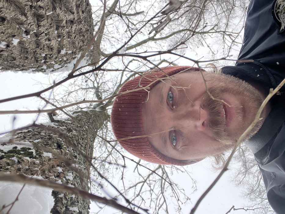 An adult male is depicted outdoors in a low-angle, upward-facing shot within a winter environment in Pargolovo, Russia. He wears a burnt orange knit beanie and a dark, possibly black, jacket. His face features blue eyes, a visible mustache, and light beard growth, with a neutral expression. Small snowflakes are present on his beanie and jacket, indicating active snowfall. In the immediate foreground, thin, bare tree branches partially obscure the view. Above and behind the subject, two thick tree trunks with textured bark are heavily coated in snow, with some visible green moss or lichen. The background reveals a dense network of bare tree branches against an overcast, white sky, confirming a snow-covered, dormant forest or park setting.