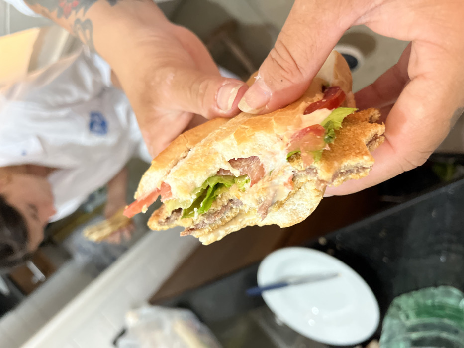 A sandwich is held in two hands. It appears to be a submarine sandwich, cut in half with a portion missing. Lettuce, tomatoes, and meat are visible within the sandwich. A plate with a knife on it is in the background. The hands are fair-skinned with tattooed arms. The background is a kitchen with some cabinets and the person holding the sandwich appears to be wearing a white shirt.