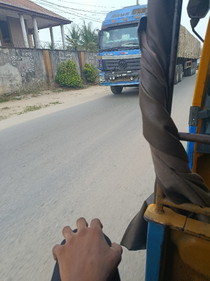 The image depicts a roadside scene in Warri, Nigeria, captured from the perspective of a moving vehicle, likely a commercial tricycle or "Keke Napep," indicated by the visible yellow and blue metal frame and dark brown fabric on the right. In the bottom left, a human hand is visible, partially clenched, resting on a dark surface. A blue FOTON AUMAN heavy-duty truck with "KONTEU" visible on its cab's sun visor is the primary subject in the mid-ground, traveling towards the viewer on a grey asphalt road. The truck pulls a multi-axle trailer covered by a light brown tarpaulin. To the left of the road, a weathered grey concrete perimeter wall, featuring decorative block patterns and vertical orange accents, is topped with barbed wire. Two small, manicured green bushes are planted in front of this wall. Behind the wall, a residential structure with a brown tiled roof and white pillars is partially visible, interspersed with palm trees and other dense foliage under an overcast sky.