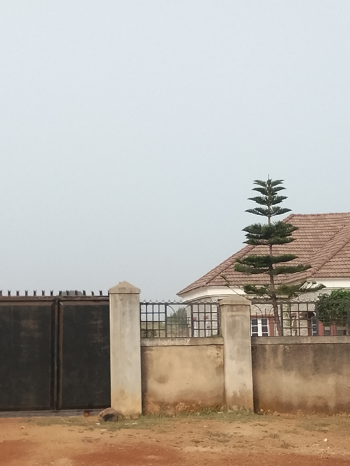 The scene depicts an exterior view of a residential property in Gu, Nigeria, under an overcast, light-gray sky. The foreground consists of reddish-brown compacted earth with sparse dry vegetation and scattered small stones. A weathered concrete perimeter wall, approximately 1.5 meters high, runs across the mid-ground, exhibiting discoloration and minor staining. It is topped by black metal fencing. A substantial, dark-colored metal gate with sharp, upward-pointing spikes along its top edge occupies the left portion of the frame, adjacent to a concrete support pillar. Further right, another concrete pillar flanks a section of dark square-grid metal fencing. Behind the fence, a house featuring a reddish-brown clay tiled roof is partially visible. A tall, slender evergreen tree, characterized by distinct, widely spaced horizontal tiers of dark green foliage, stands directly in front of the house, extending above the perimeter wall. White-framed windows are partially discernible through the metal grid fence on the house facade. No individuals or active subjects are present.