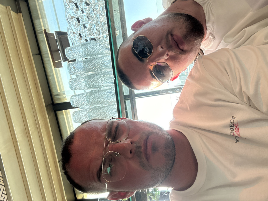 Two adult males are depicted in a close-up, likely a selfie, within a bright commercial establishment, possibly a bar or restaurant, in Sofia, Bulgaria. The individual on the left, foregrounded, has short dark hair and light stubble. He wears clear-lensed, gold-framed aviator-style eyeglasses. His attire consists of a white long-sleeved t-shirt featuring a red and black embroidered logo on the chest, partially legible as "PROJECT VIBE". His left eye is partially closed, and his expression is serious. The second individual, partially visible to the right and slightly behind the first, also has short dark hair and a short beard. He wears dark, reflective, gold-framed polygonal sunglasses and a white long-sleeved garment. His gaze is directed toward the camera with a neutral to serious expression. In the background, behind the subjects, a clear glass shelf holds multiple stacks of patterned drinking glasses and a row of inverted stemmed wine glasses. Behind this glassware, large windows or glass panels reveal an outdoor view under bright daylight, with a beige retractable awning structure visible overhead. Specific identifying features for an exact location within Sofia are not discernible from the image.