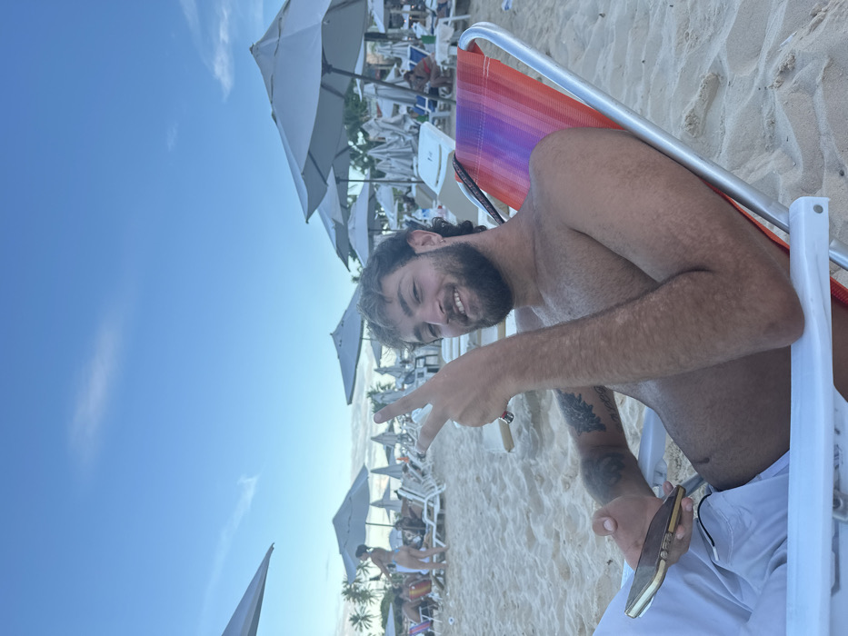 This image captures a beach scene in Cairu, Brazil. In the foreground, a young adult male with dark, curly hair styled in a mullet, a full beard, and a mustache is seated in a multicolored beach chair, directly facing the camera. He is smiling and making a "peace" sign (V-sign) with his right hand. He is shirtless, displaying a tanned complexion with patches of lighter skin on his arms, and a dark tattoo on his left bicep. He is wearing light-colored shorts and holds a gold-colored smartphone in his left hand. The beach chair has a white frame and a seat with horizontal stripes of orange, pink, purple, and blue. The ground beneath him is light-colored sand. In the mid-ground and background, numerous white beach umbrellas are open, shading rows of white lounge chairs, many occupied by other individuals. One female, dressed in a light-colored bikini, is standing with her back to the camera in the mid-ground. Palm trees are visible in the far background. The sky is clear blue with a few faint wisps of clouds, under conditions of natural daylight, possibly late afternoon.