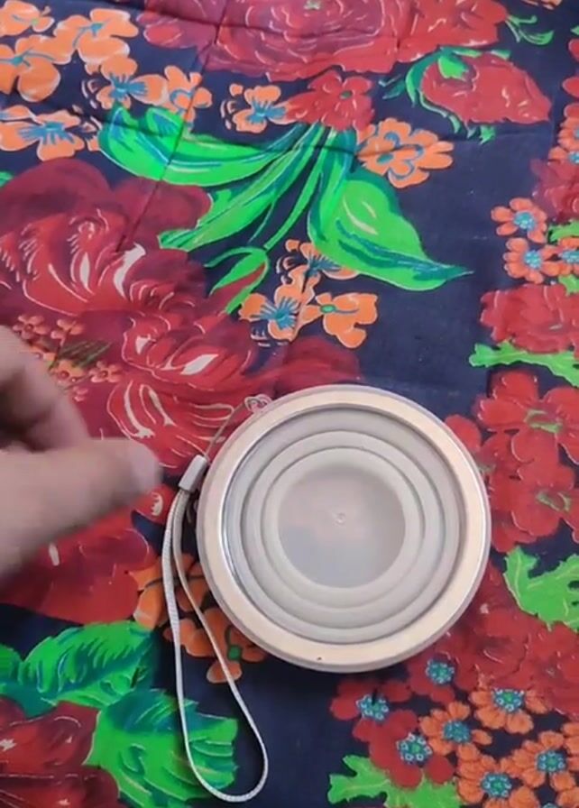 A hand is shown holding a white collapsible cup