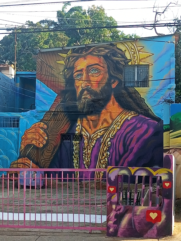 The image displays an outdoor scene in La Asuncion, Venezuela, featuring a large, vibrant mural covering the side of a building