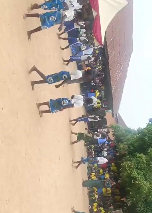 A group of people, some wearing matching blue patterned skirts and white shirts, are seen walking in a line on a sandy ground. An audience stands behind them, and a tent with white and red fabric is erected in the background. The line of people is facing the camera but walking in an offset direction. A man in the center of the line holds a wooden object, while another carries a round container. The area is open, with a building with a corrugated roof and trees in the background.
