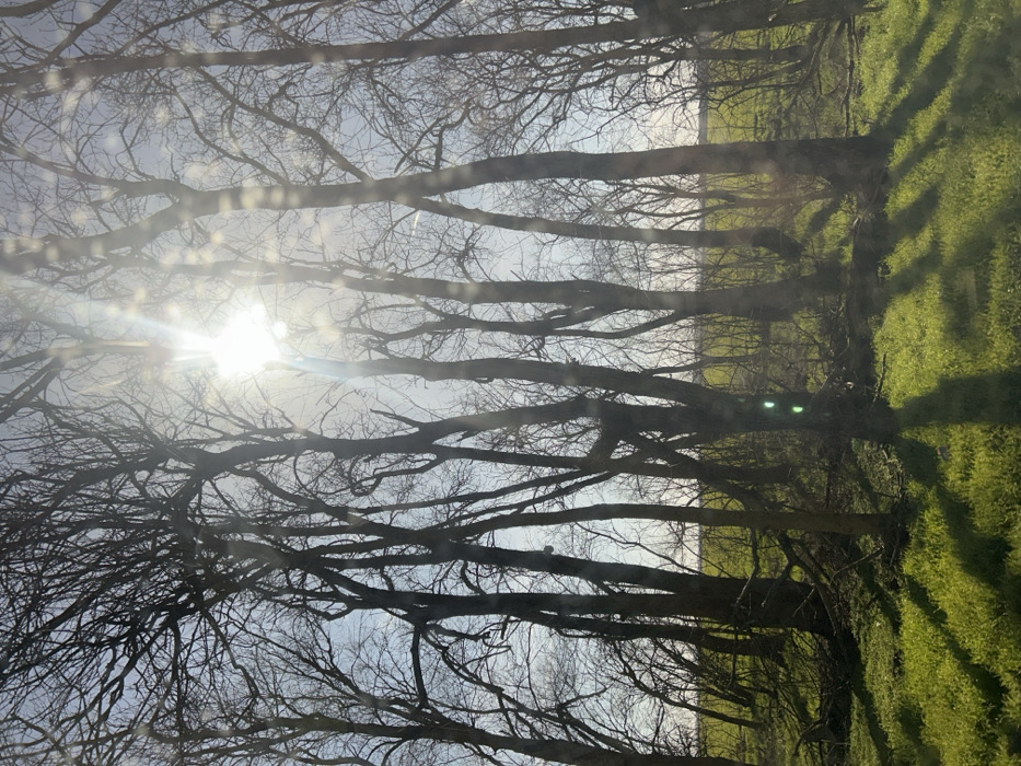 The image depicts a wooded edge in Senokos, Bulgaria, under direct sunlight. Numerous deciduous trees, largely bare of foliage, dominate the frame, silhouetted against a pale blue sky. The sun is prominently visible in the upper center, emitting bright rays and lens flares. Elongated, distinct shadows from the tree trunks extend across a vibrant green grassy ground cover in the foreground. Scattered fallen branches are present on the forest floor. Beyond the immediate tree line, a wide, bright green field is visible in the mid-ground. No individuals, animals, or active subjects are present.