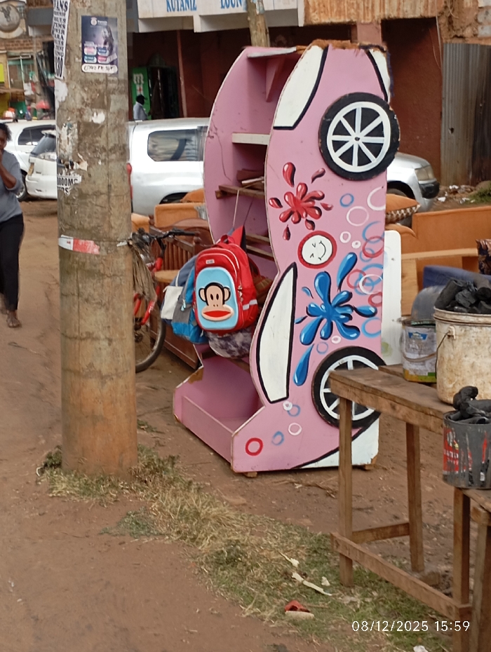 The image depicts a commercial street scene in Ngong ward, Kenya, captured on December 8, 2025, at 15:59. In the foreground, a weathered wooden utility pole stands on the left, covered with multiple faded paper advertisements. Its base is surrounded by exposed dirt and sparse dry grass. To the right of the pole, a large, upright, pink-painted wooden display stand is prominent. This stand features abstract curves, painted white wheels with black spokes, red and blue paint splatters, and white circular and dot patterns. A red and light-blue backpack, adorned with a white monkey face design, hangs from a hook on the left side of this display stand. Further to the right, a rudimentary wooden table holds a dark-colored bucket containing dark, irregular solids, likely charcoal. A lighter-colored bucket is partially visible behind it. In the midground, a red-framed bicycle is parked behind the utility pole and the pink display stand. Various pieces of furniture, including upholstered items and wooden frames, are visible behind the display stand, suggesting an outdoor merchandise arrangement. Several vehicles are present in the background, including a white sedan or SUV and a silver SUV. Commercial buildings line the street in the background. One building exhibits partial faded white lettering, appearing as "KUTANIZ LOUN". Corrugated metal structures are also visible further back. One individual, dressed in dark clothing, walks away from the camera on the far left side of the frame. Another person, wearing a light-colored top, is partially visible inside a doorway of a building in the background. The ground throughout the scene is predominantly unpaved dirt with scattered debris.