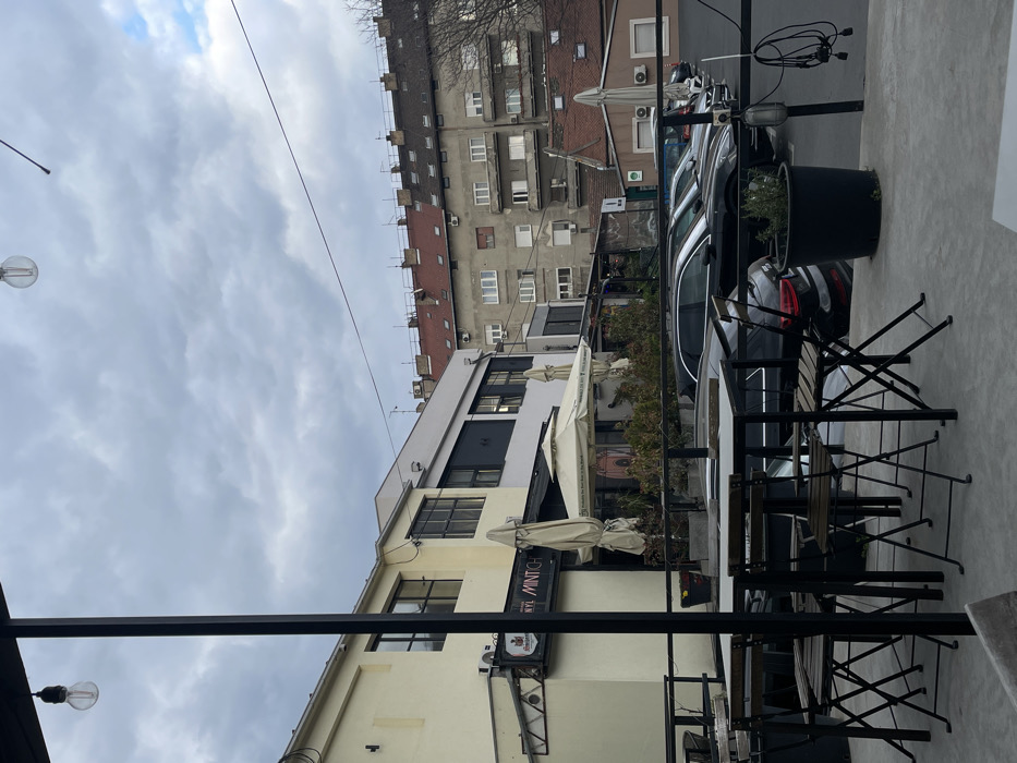 This image captures an urban scene from an outdoor patio in Belgrade, Serbia, facing the establishment "Novi Mintić" under an overcast sky