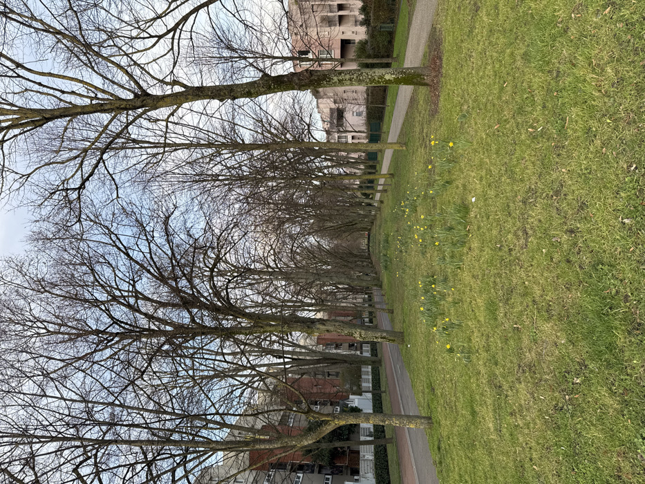The image depicts an urban green space or parkway in Noisiel, France, viewed longitudinally under a partially overcast daytime sky. The central foreground and midground feature a wide strip of green grass, containing numerous clusters of yellow daffodils in bloom. A long avenue of bare deciduous trees with intricate branches lines both sides of this grassy area, extending into the distance and creating a visual tunnel effect. On the left side of the image, running parallel to the grass, is a paved road or pathway, dark grey in color with a reddish-brown curb. Beyond this pathway, a low white barrier or fence is visible, followed by multi-story residential buildings exhibiting varied facades, including light grey and red brick sections with dark-framed windows. On the right side, parallel to the grass, a narrower, unpaved dirt or gravel path is present. Beyond this path, additional residential buildings with a muted pinkish-beige coloration and visible balconies are observed. Green shrubbery or hedges are situated in front of some of these structures. No individuals, animals, or vehicles are present in the scene. The bare trees and blooming daffodils indicate an early spring season.
