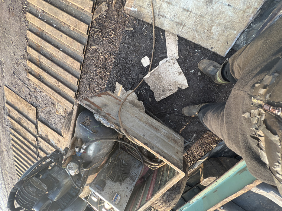 The image depicts a first-person, downward-facing view of a person standing amidst industrial debris in an outdoor area of Andijan City, Uzbekistan. The person is wearing dark pants, which appear worn near the zipper, and dark, utilitarian boots. In the mid-ground and left, a disassembled or discarded industrial air compressor unit is prominent. It features a dark grey tank, cooling fins, tubing with blue and red valves, and an electrical component with a fan grate. Numerous cables, wires, and hoses are intertwined with the machinery. Adjacent to and beneath the compressor are various pieces of rusted and corroded sheet metal. A light-colored, possibly painted metal beam is visible on the far left. The ground is composed of dark, uneven soil mixed with gravel and detritus. Towards the upper right and extending to the right, several rusty, corrugated metal sheets are laid flat on the ground. Scattered across the ground are white or light-colored fragments, consistent with broken board or paneling material. The scene appears to be an outdoor storage or salvage area, illuminated by natural light casting shadows to the viewer's left.