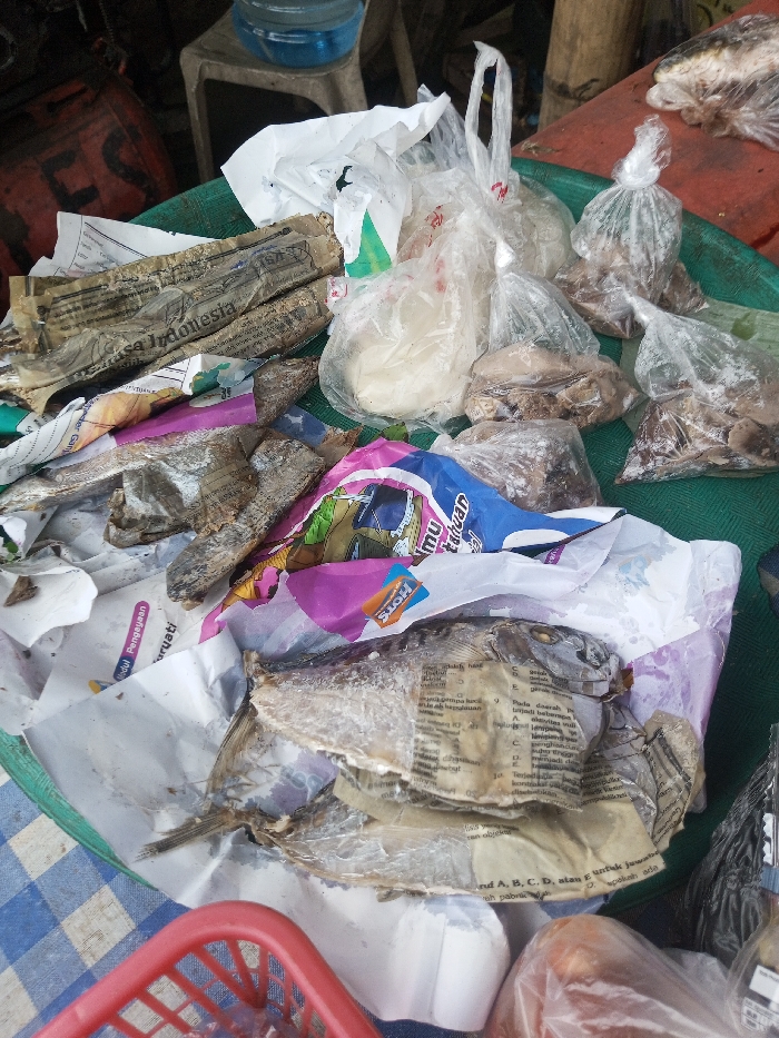 A circular green tray holds a variety of food items, seemingly for sale at a market. Dried fish wrapped in newspaper and other paper scraps are prominent. Several clear plastic bags contain what appears to be dough or flour and pieces of meat or vegetables. A partially visible blue and white checkered surface is at the bottom left and a red plastic basket is in the foreground. In the background, there is a clear plastic container on top of a white stool.