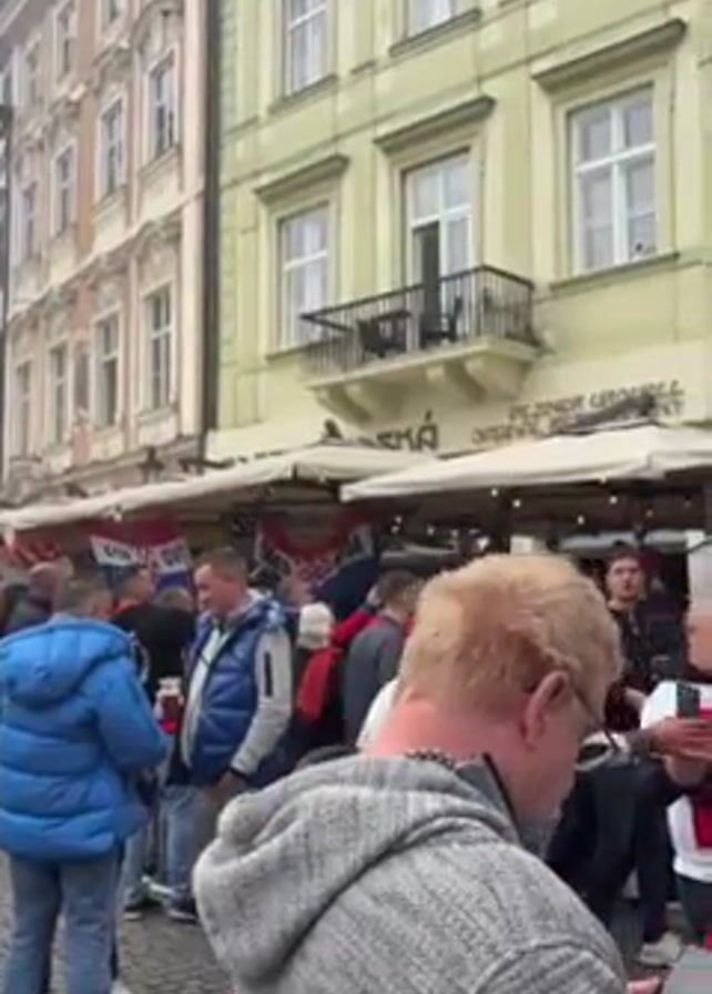 crowd of people gathered on a cobblestone street, in front of a building with outdoor seating. Many are wearing red and white checkered clothing, and waving checkered flags. Some are drinking from cups. The buildings are painted in light pastel colors and have multi-paned windows. There is a sign above the outdoor seating of one of the buildings that reads “Pilsner Urquell Restaurant”. Someone is recording the scene with their cell phone. The audio captures a crowd singing.