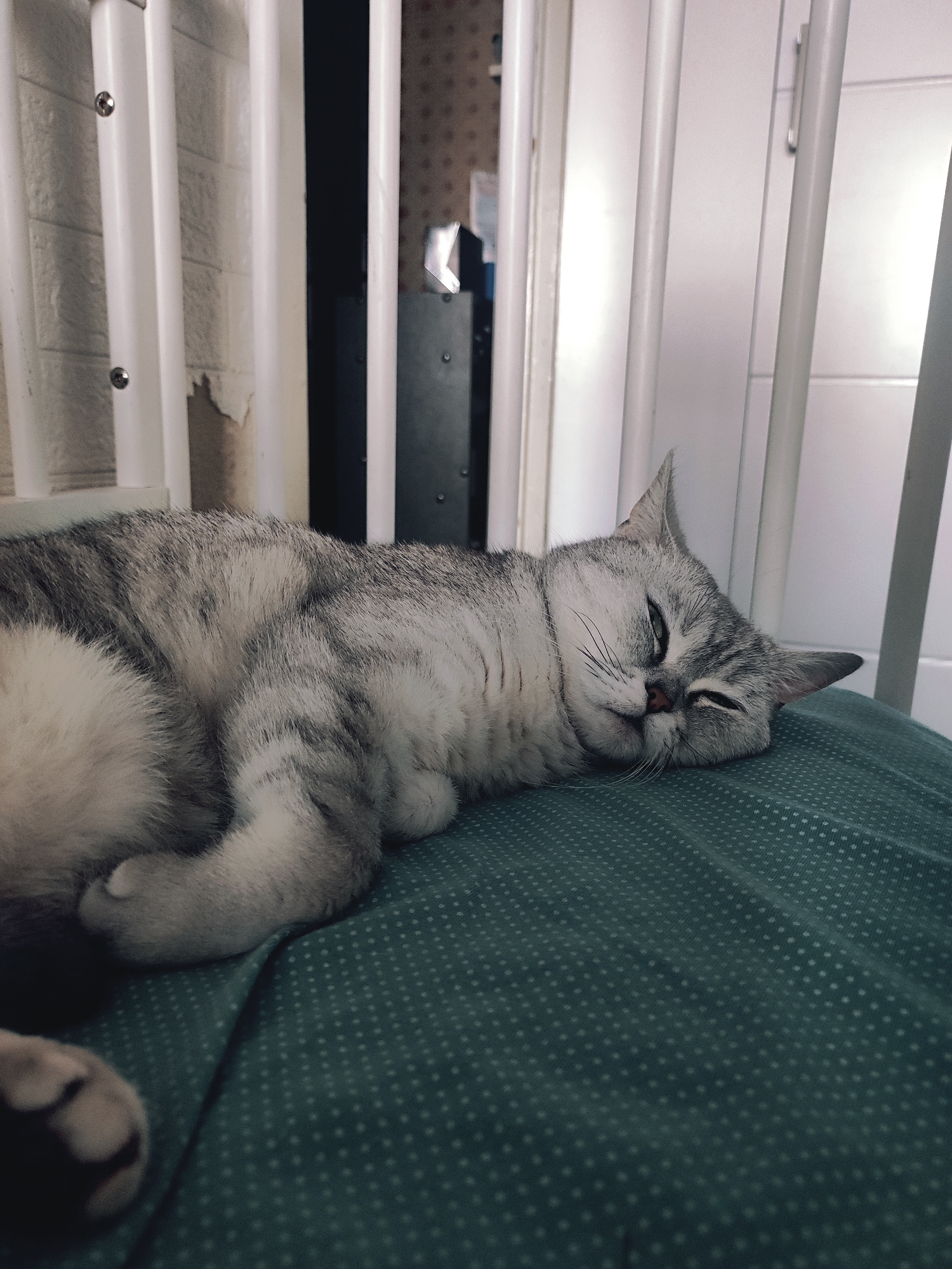 The image displays a silver-grey tabby cat resting on its left side on a dark green textile surface patterned with small, lighter green dots. The cat's eyes are partially closed, indicating sleep or drowsiness. Its fur exhibits distinct grey stripes across a lighter grey and white base, with a pinkish-brown nose and prominent white whiskers. In the background, a series of vertical white cylindrical bars are visible, likely part of a barrier or piece of furniture. To the left of these bars, a light-colored wall with textured wallpaper is discernible, featuring a section of peeling material. To the right, a dark vertical panel and a segment of a white door or cabinet with a silver handle are present. The scene occurs indoors, within a residential setting in the city of Unknown, Unknown.