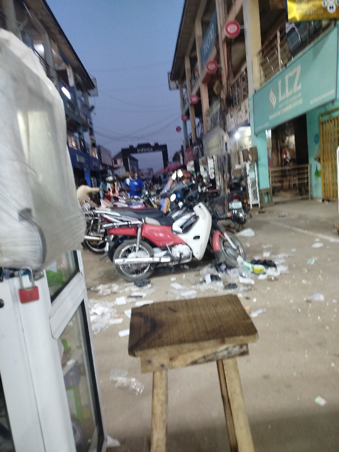 A bustling street scene shows a narrow road filled with litter and parked motorcycles. Buildings line both sides of the street, with signs and architectural details visible. A wooden stool occupies the foreground. A structure with "INFINIX" is visible in the distance. The sky is overcast, suggesting either dawn or dusk. Overall, it is a vivid snapshot of a busy urban thoroughfare.