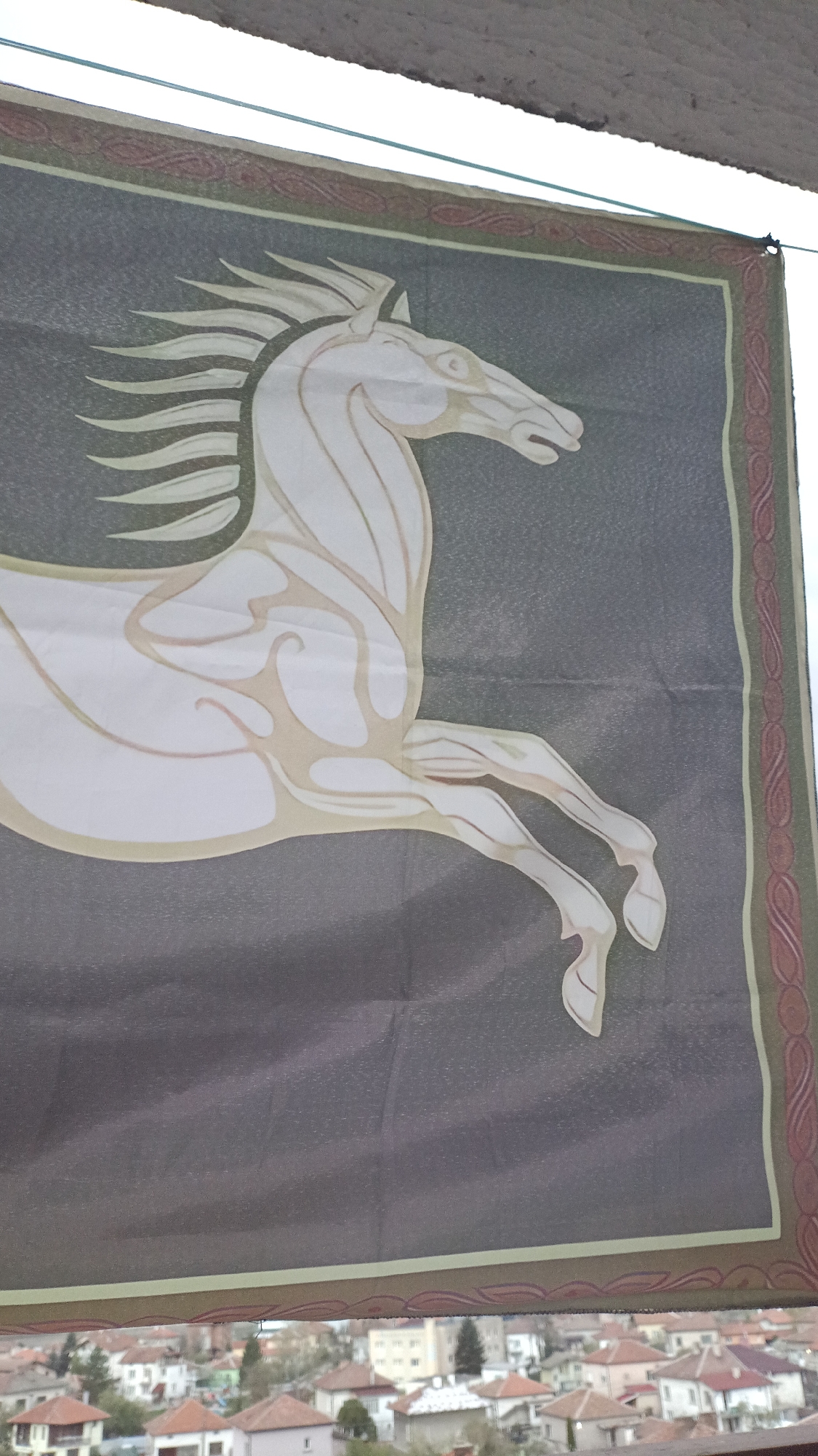A slightly angled medium shot depicts a large tapestry banner featuring a white horse in mid-gallop set against a grey background. The banner is hung outdoors, with a view of a town in the background. The tapestry has a patterned border featuring repeating shapes in a green and maroon color scheme. Above the tapestry, a small section of a concrete structure is visible. Below, a cityscape of Slivnitsa, Bulgaria, showcases closely packed houses with varied roof colors, predominantly orange and red. Trees are interspersed amongst the buildings, suggesting a residential area. The shot is taken during daylight.