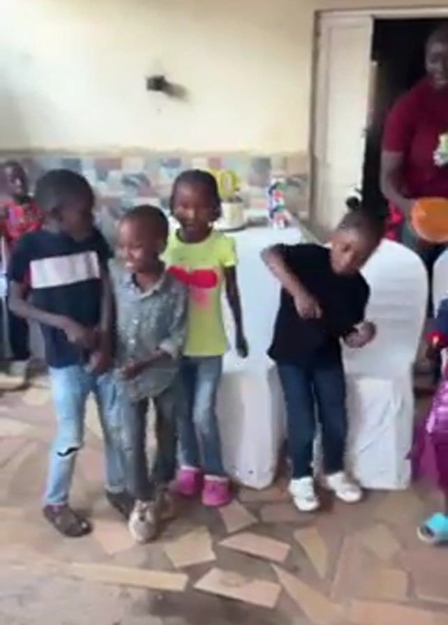 A small group of children dance near some folding chairs, a table with a cake and beverages, and an adult holding balloons. The children are dressed in casual clothes and are dancing with varied energy, jumping, and laughing. The adult, dressed in a red plaid shirt over a maroon t-shirt, appears to be interacting with the children, possibly leading a celebratory activity. The scene takes place on a concrete patio in front of a white wall.