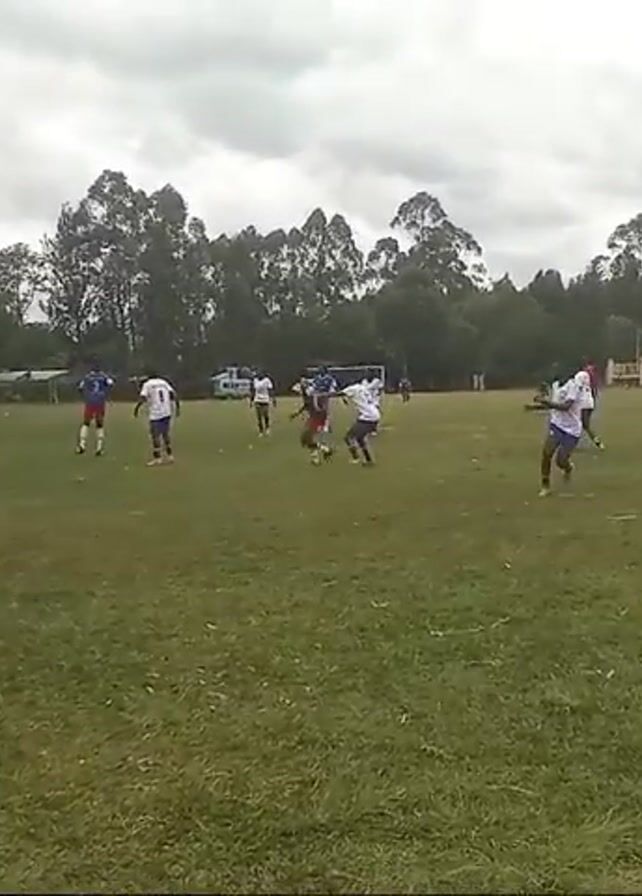 soccer match in progress on a grass field. The sky is overcast. There are trees lining the back of the field, and a fence runs along the side. Players wearing white and blue uniforms are spread across the field, running and kicking a soccer ball. One player in a green uniform appears to be a goalie. Several people stand or sit along the sidelines, watching the game. A person in a red shirt walks along the side of the field. A small building can be seen behind the fence on the far right of the frame.