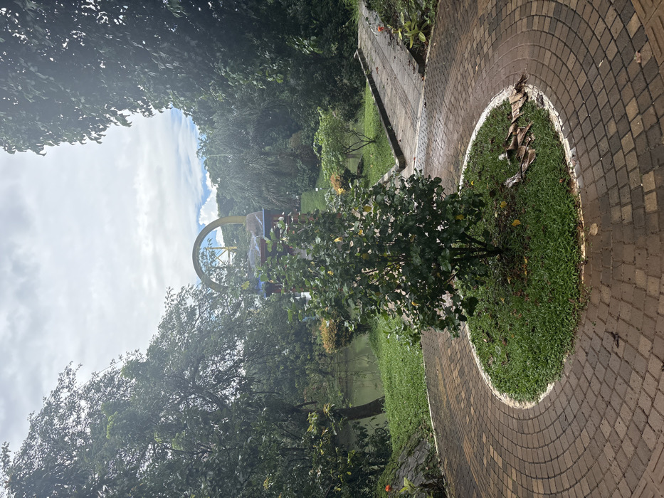 A walkway of curved bricks edges a round patch of green grass with a small tree in the center. In the background, a water fountain with a golden arch is visible through the trees. A small pond is surrounded by green grass and foliage. Trees encompass the area, leading to a partly cloudy sky.