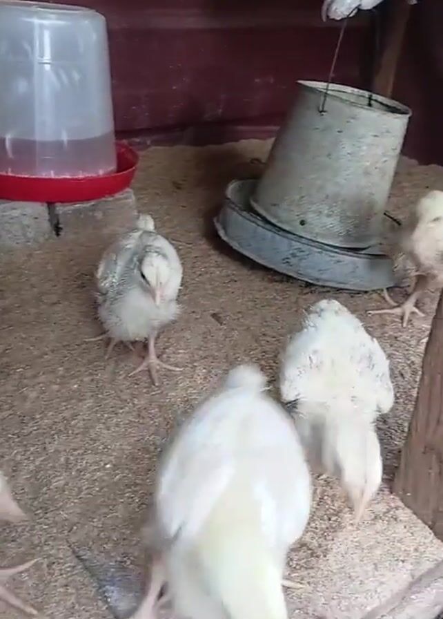 small group of chicks in a coop. The chicks are mostly white with some gray spots. They are standing on a bed of wood shavings. There is a red and clear water dispenser and a metal feed dispenser in the coop. A hand is visible in the lower right corner of the frame.
