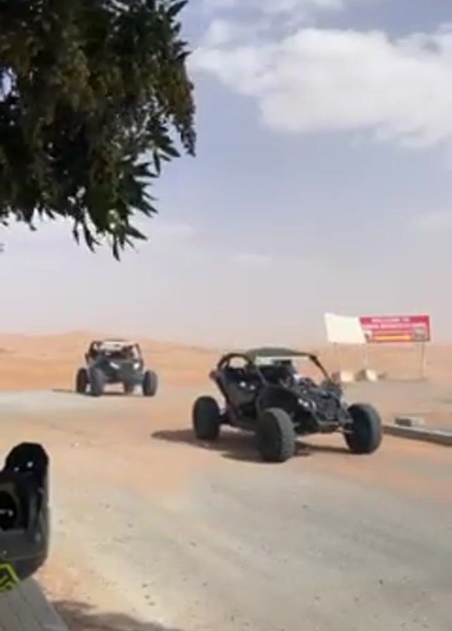 two black off-road buggies driving up to a paved road in a desert environment. The camera is positioned to the side of the road, under the shade of a tree, and shows the buggies coming toward the viewer. The sky is partially cloudy and a bit hazy, possibly due to the desert dust. A sign with writing on it is visible in the background. The vehicles appear to be stopping or slowing down near the road. There are no visible people outside of the buggies.
