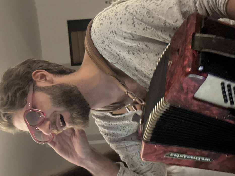 In Canggu, Indonesia, a male individual is depicted in a medium shot, facing left in profile. He has light brown, wavy hair and a full beard. He is wearing large, pink-tinted aviator-style sunglasses. His mouth is open, suggesting he is speaking or singing, and his right hand is raised, cupping his right ear. He is dressed in a light-colored, long-sleeved shirt with a speckled or textured pattern, featuring a wide neckline. A dark brown leather strap is visible over his right shoulder, attaching to a red, marbled accordion. The accordion, partially visible in the lower left foreground, bears the label "Weltmeister" and features black bellows and white keys/buttons. The background is softly blurred, showing a light-colored wall and a dark, rectangular element to the upper right. A portion of another person's arm or shoulder is visible on the far left, behind the main subject.