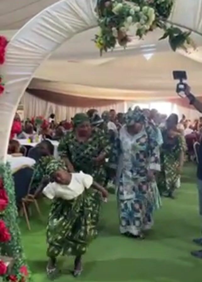 A group of people, including a young girl, are dancing through an arched doorway in a decorated tent. The adults, mostly women, are wearing similar traditional patterned outfits, while the girl has on a white top and a similar patterned skirt. A person on the right side of the frame is filming the procession with a smartphone. The tent interior is visible, showing tables with seated guests in the background. The arch is decorated with white fabric and floral arrangements in shades of pink, red, and green.