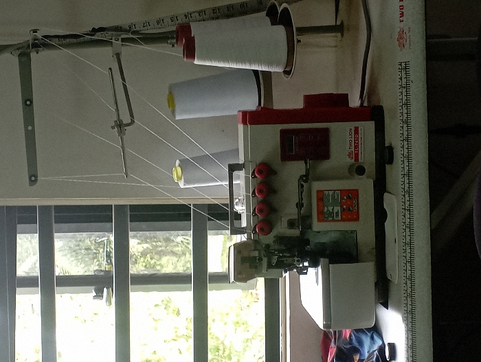 The scene depicts an indoor industrial textile workspace in Alor, Nigeria. A Two Lion TL-747D overlock sewing machine, white with red side panels and thread tension controls, occupies the center-right of a light-colored work table. Four white threads are loaded into the machine, extending upwards to four large spools on a metal stand positioned to the right. Three spools are white, two with yellow top caps and one with a red top cap, while the fourth is white with a red base. A rigid measuring tape, marked in inches and centimeters, is affixed along the front edge of the table. A flexible white cloth measuring tape hangs from the thread spool stand. To the left of the machine, a crumpled piece of multi-colored fabric is visible. A large window with dark horizontal frames dominates the left side of the image, admitting natural light and revealing green foliage outside. The background wall is plain and light-colored. No individuals are present in the frame.