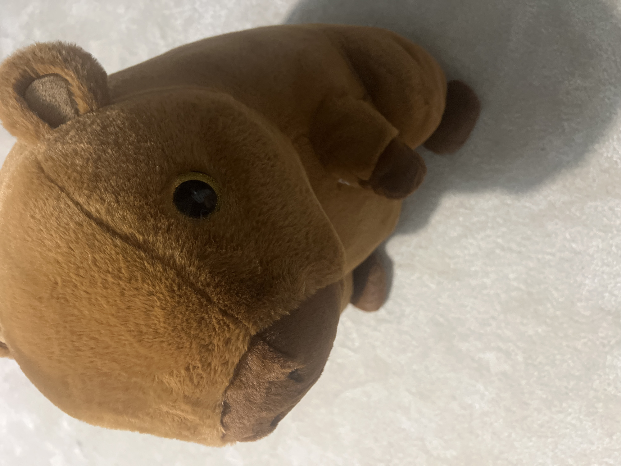 A close-up shot shows a plush brown capybara toy lying on a white surface