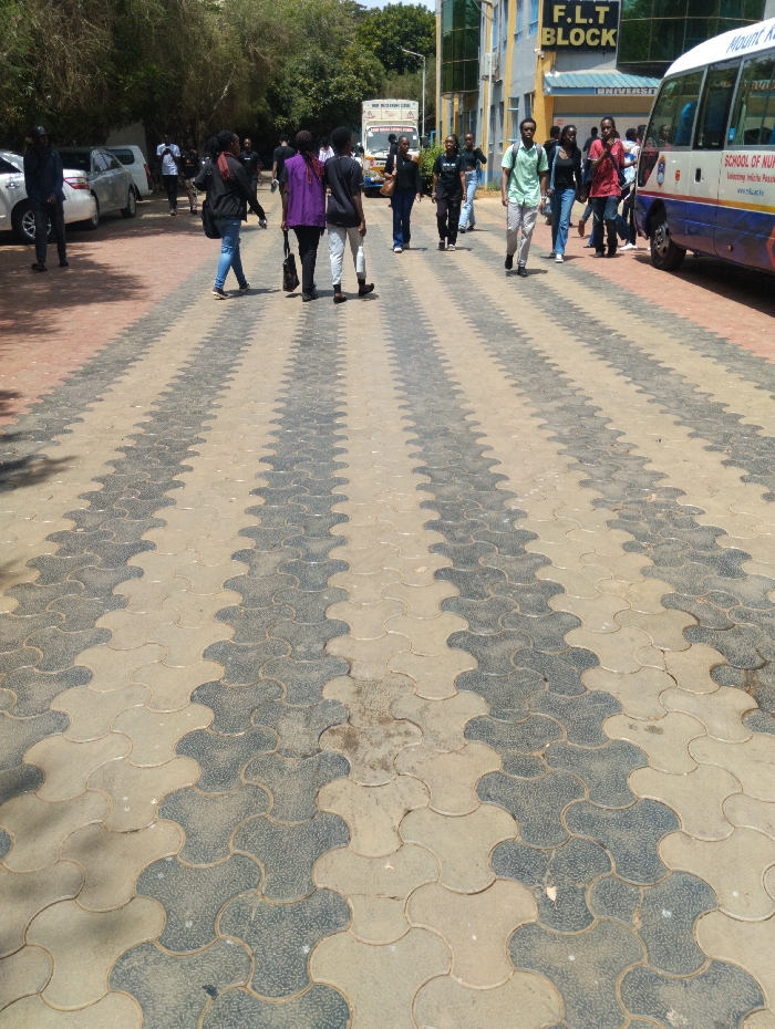 The image displays an outdoor paved pathway situated on a university campus in Kenya