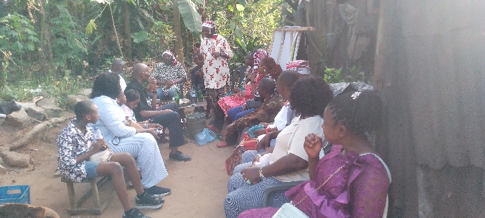 A group of people, adults and children, gather outdoors on chairs and small stools. A man stands speaking, dressed in patterned attire and a traditional red-and-white hat. The setting is somewhat rural, with trees and foliage visible in the background. A few beverage containers are present on the ground near the man speaking. The atmosphere appears casual and conversational.