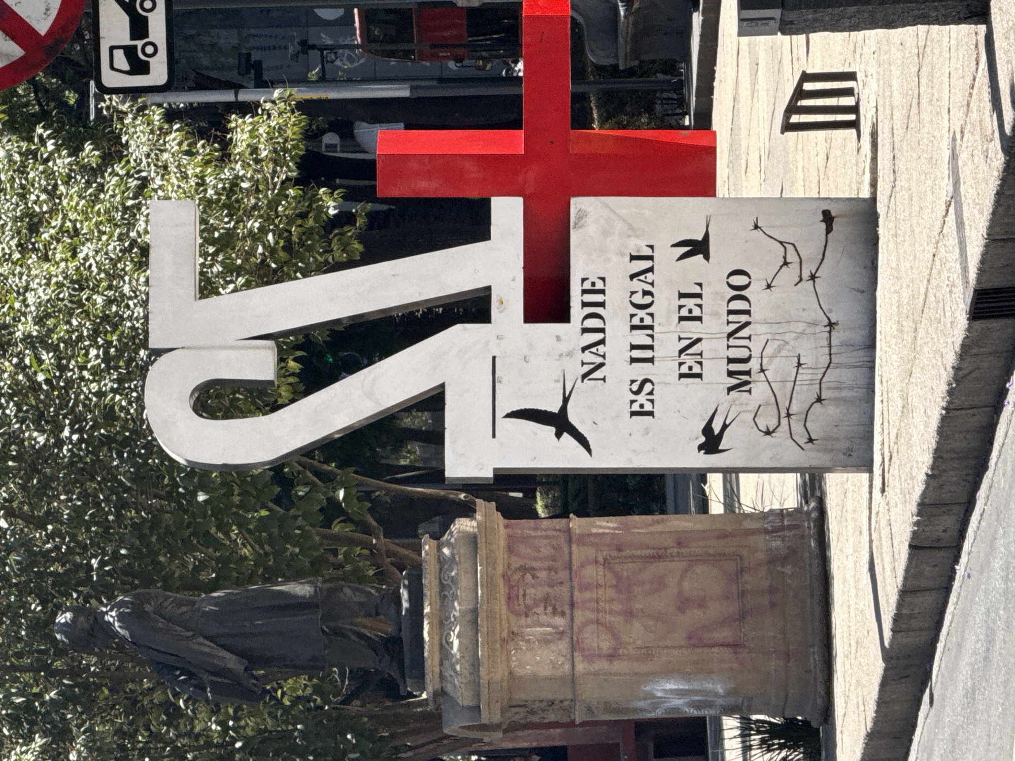 street scene in Mexico City, Mexico. The prominent features are a sculpture or monument with a sign that reads "NADIE ES ILEGAL EN EL MUNDO" ("No one is illegal in the world"). Above the text is the image of two swallows and barbed wire. This sign is positioned on a base, likely part of a larger statue or monument. The number "15" in large white lettering and a large red cross are above the sign. Vegetation is present, including trees, and in the background, there are city elements like street signs and potentially buildings. The street surface is visible in the foreground.