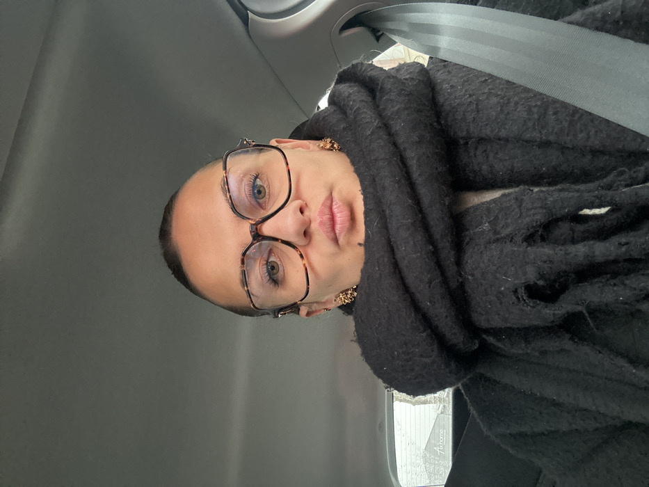 A person with glasses and a black scarf, seated in a car and wearing a seatbelt, is photographed up-close. The individual's eyes are blue-green, and their hair is pulled back. They are wearing gold earrings and have a light complexion. The image is taken at an angle, with the interior of the car visible in the background. The overall lighting is natural.