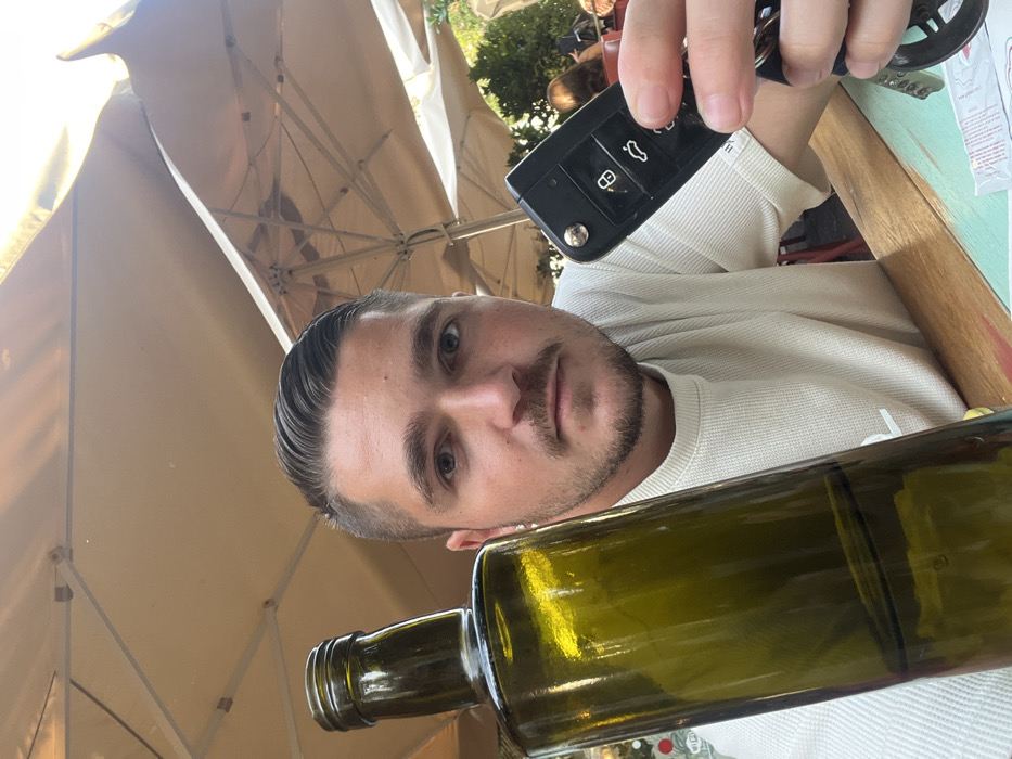The image portrays a male individual, appearing to be in his 20s or 30s, seated at an outdoor cafe in Holon, Israel. He has short, dark hair styled with a fade, light-colored eyes, and light facial stubble, wearing a light-colored waffle-knit shirt. He looks directly at the camera with a neutral expression. In his left hand, he holds a prominent dark green glass bottle, partially filled with liquid. In his right hand, he displays a black car key fob, likely for a Volkswagen vehicle, attached to a keychain. The table in front of him features a wooden surface and a painted light green section with reddish marks, along with a white paper packet. The background consists of large, light-colored outdoor umbrellas providing shade, blurred foliage, and indistinct forms of other patrons, indicating a typical daytime outdoor dining establishment.