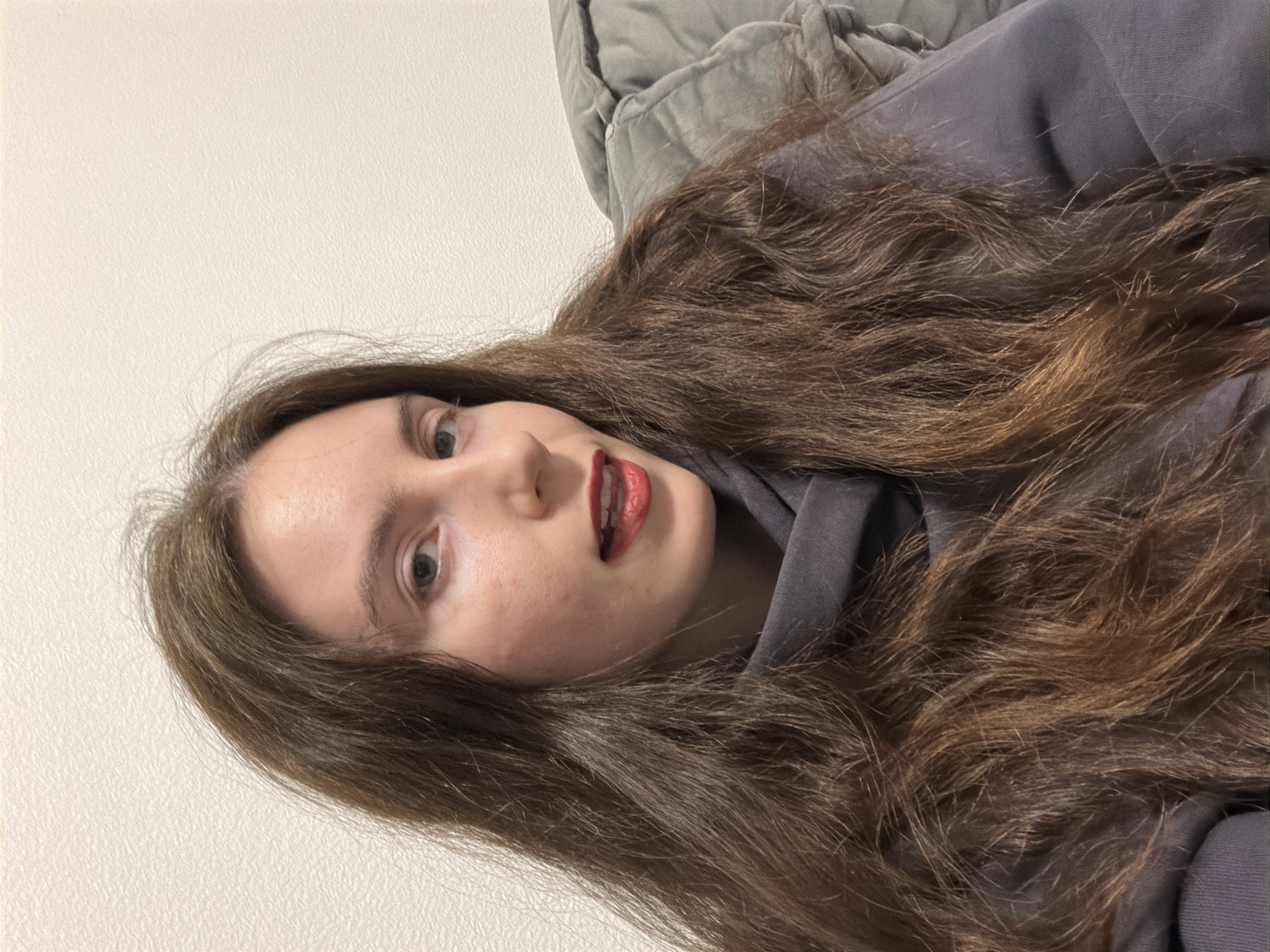 A single female individual is depicted in a medium close-up, centrally framed. She has long, wavy brown hair, blue eyes, and fair skin. Her lips are coated with red lipstick, and her mouth is slightly open, revealing some upper teeth and a portion of the tongue. She is wearing a dark gray hooded garment. Her head is angled slightly to the left, and she is looking directly forward. The background consists of a textured, plain light-colored wall. To the right of the subject, a gray, padded object, consistent with a cushion or part of a sofa, is partially visible. The scene appears to be an indoor, domestic setting. The image provides no specific visual indicators to confirm the location in the city of Yanino-1, Russia.