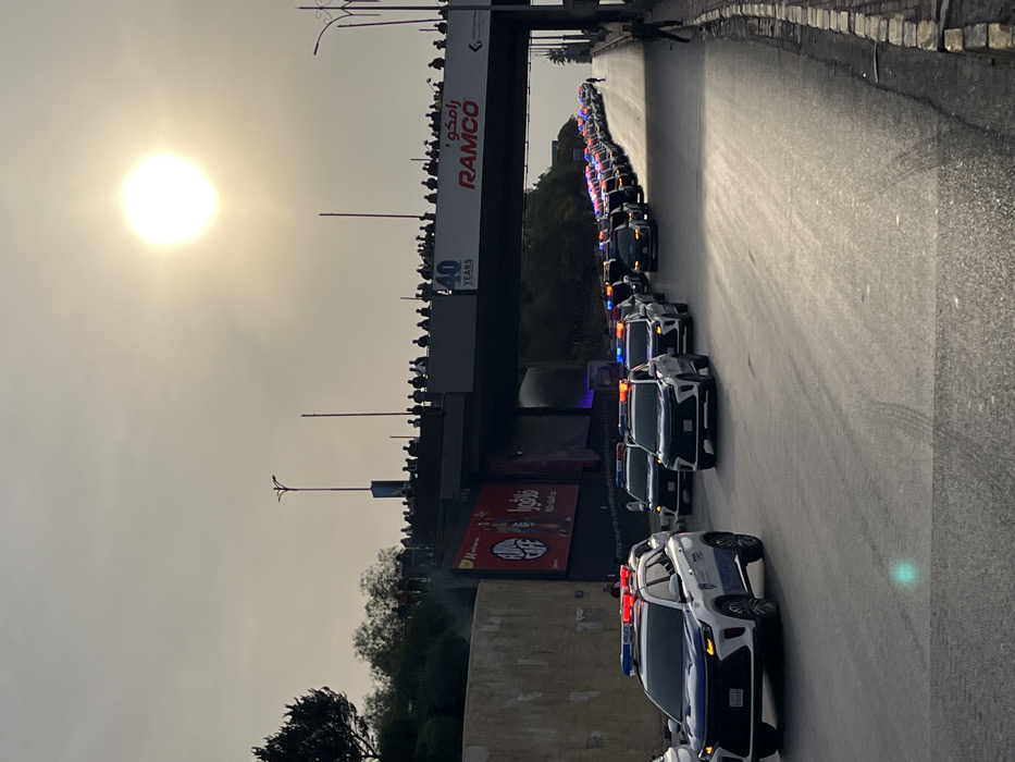The image depicts a lengthy convoy of police vehicles on an upward-sloping asphalt road in Al-Mazza Municipality, Syria, during late afternoon or early evening